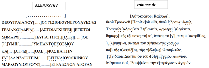 is also found at Ephesos5 and Kyzikos6 (Tüner Önen, 2008:318-319). Str. 1 ΠΑΡ...ΟΥ, CIG. Str. 3 ΟΥΣΙ..ΙΕΥΠΑΤΟΤΟΤΟ.ΑΤΡΙΟΣ, CIG; ἐξουσί[ας τὸ β´] ὑ[π]άτ(ω) τὸ β´ τ[ῶ]ι θε[ῶι] van Buren. Str. 4 ΤΟΣΚΟΣΝΟΥ, CIG. Str. 5 ΑΤΡΙ .Ο..ΤΗ.ΦΑΣΗΛΙΚΩΝ, CIG; π]α[τ]ρί[δος, τῆς] τ[ῶν] Φασηλειτῶν Van Buren. Str. 6 ΤΕΙΜ ..ΣΕΗΛΙΟΥΛΙΚ, CIG; Τ(υ)[ν]δαρὶς Διοτεί[μου, γυνὴ] Γ(α)ΐου van Buren. The name Τυνδαρίς is not a common name in Anatolia, Greece and the islands. Dioteimos Rufinus, mentioned in the inscription as the father of Tyndaris, was originally the son of a man named Gnaius Licinius, but was later adopted by another man named Marcus. Διότειμος = Διότιμος. This name, which is quite common in Lycia, has so far only been documented for one person in Phaselis (Tüner Önen, 2008:318-319). Str. 7 ΜΑΡΚΙΟΥ, CIG; Μάρκου υἱ[οῦ], Ῥουφ[είνου Π]ετρ(ω)[νια]νο(ῦ) ἀγοραν-| [ομοῦντος .....], van Buren. The Roman epithet Ῥούφεινος = Ῥούφινος (lat. Rufinus) is documented for only one individual at Phaselis. The reference to the Tetragonal Agora in this line was first made by Kalinka. Since this line completes the tabula, it seems certain that the words τετράγωνον ἀγοράν complete the inscription, but earlier scholars accepted the verbal form ἀγοραν[ομοῦντος] for one more line, and this error persisted in studies much later than Kalinka (Tüner Önen, 2008:318-319)." |