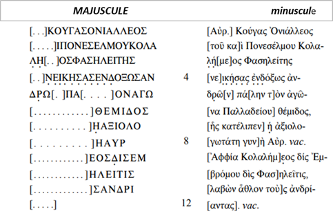 "Aurelius Kougas of Phaselis, son of Oniallis, also known as Poneselmos, son of Kolalemis, won the wrestling competition in the adult men's category of the Palladeios agon, bequeathed by Aurelia Apphia of Phaselis, a praiseworthy person, daughter of the son of Kolalemis, son of the son of Embromos, and received statues as prizes." (Akçay, 2016:56-58)" | ||||||||||||||||||