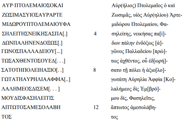 bilinen Phaselis’li Aurelius Ptolemaios, II. Embromos’un oğlu II. Kolalemis’in övgüye layık kızı Phaselis’li Aurelia Apphia’nın kente hediye ettiği ve ilk olarak düzenlenen Palladeios Agon’unun çocuklar katagorisi güreş müsabakasını sırtı yere gelmeden ve belini kavratmadan üne değer bir şekilde kazandı(Akçay.2016:54-55) |